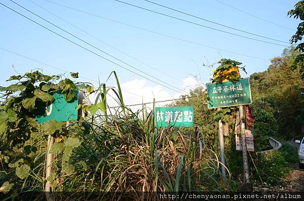 轉彎處坡道上有個牌子寫:往五子寮林道起點,不過因為在專彎處,雜樹又多,很容易忽略。