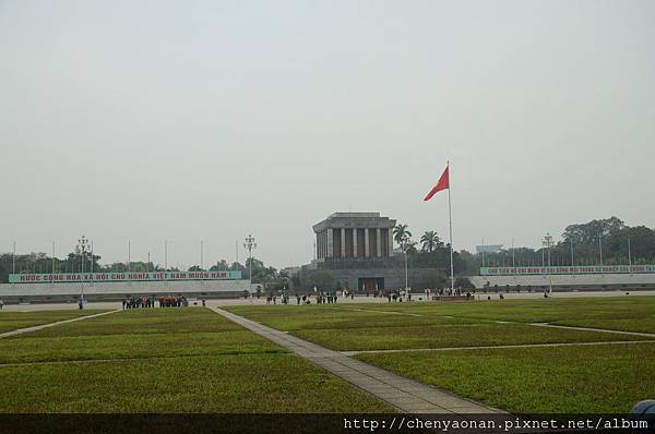 【胡志明陵寢】位於巴亭廣場上,是一棟灰色大理石為建材的四方型建築,由北京幫忙設計,類似中國天安門廣場。胡志明先生一生貢獻越南革命鞠躬盡瘁終身未娶,生活儉樸、平易近人等偉人風範,在一些平凡小事上處處體現了其超凡的意志和人格力量。