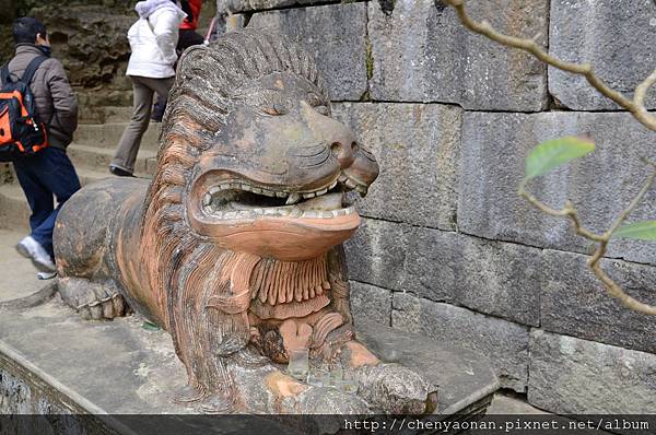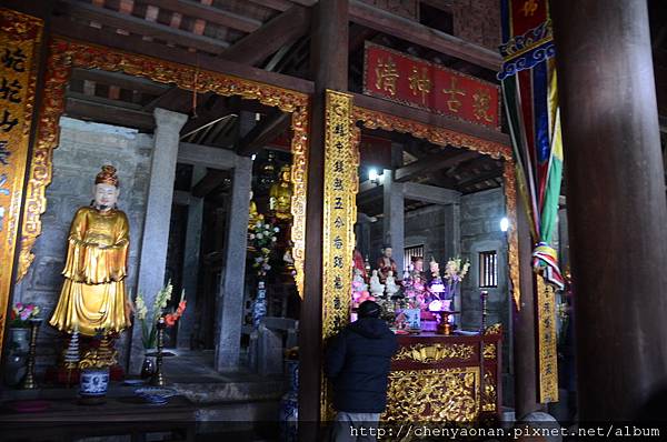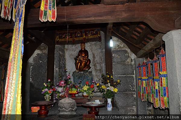 上層古廟:供俸的是觀音菩薩:領隊有說:「走到最頂層的寺廟時,有一個啞吧拿了一把點燃的香,一直拿香要給團友們,而且收費是不太合理的貴,請大家用雙手合十拜拜。」幸好我們去的時候沒有遇見這個怪啞巴叔叔。