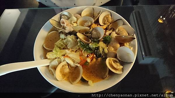 鍋燒意麵裡的食材約有: 蛤犡、高麗菜、紅蘿蔔絲、黑木耳、玉米筍、豬肉片、綠花椰菜、豆腐皮等。