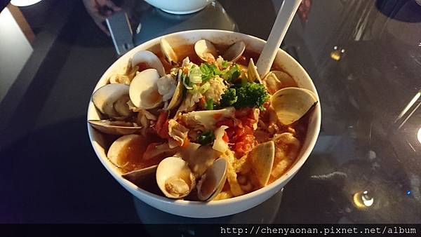 我點了「嚴選番茄」鍋燒意麵第一口就被他獨特的鍋燒意麵粗粗造型吸引, (一看就知不是外面超市買到一般好的碗型麵塊) ,吃一口意麵,蛋香撲鼻,第一口就被意麵的蛋香,吸飽了番茄湯跟蛤犡湯的鮮甜讚不絕口(桌上有小碟子可放蛤犡殼)。