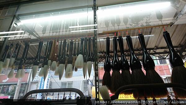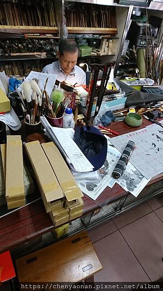 店門口,可看見一堆毛筆,玲瑯滿目,說真的也不知道要怎麼挑起。跟老闆自我介紹是從高雄慕名而來,最近要練沈尹默行書跟寫蘭亭序,給了他看最近用的筆。