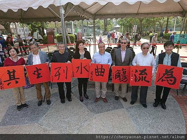 書法家張炳煌「流」、前故宮副院長何傳馨「觴」、高雄市副市長葉匡時「曲」、高市文化局代理局長王文翠「水」、何創時基金會董事長何國慶「列」及張大春「坐」分別節錄寫下蘭亭集序內文。