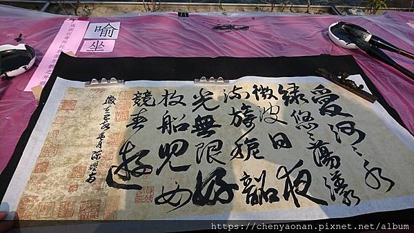 當天書寫台灣詩人-林玉書的愛河曲前四段 「愛河河水綠悠悠,蕩漾微波日夜流,旖旎韶光無限好,放船兒女競春遊。...」 ,其實我覺得在愛河寫蘭亭序,有點彆扭,再加上在場三千多人根本不可能有人在15分鐘寫完蘭亭集序,與其寫會稽蘭亭序,不如寫跟愛河有關的詩句。