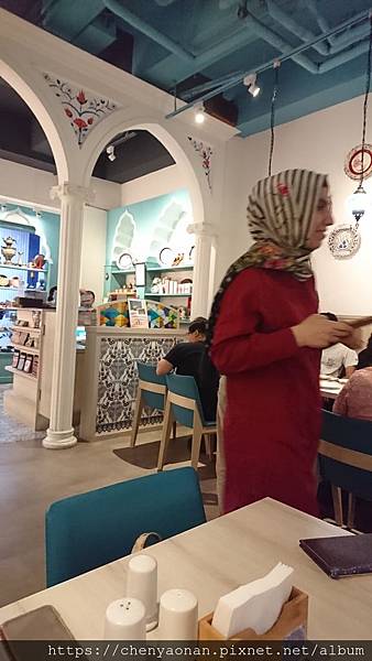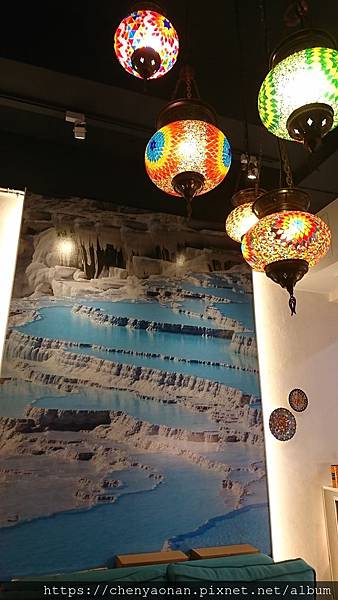 進到餐廳內玄關吊著回教國家有的馬賽克燈飾,跟一張代表土耳其世界文化遺產景點的「棉堡」照片。