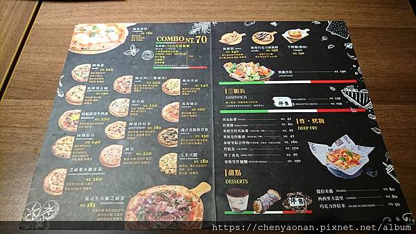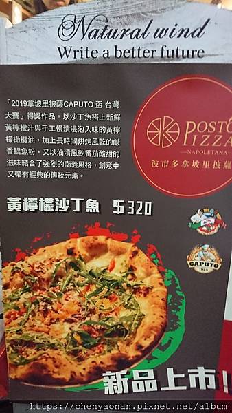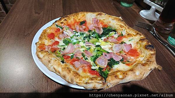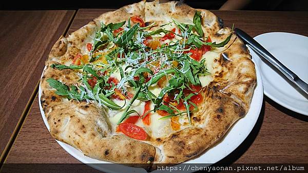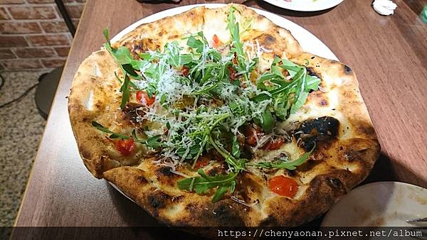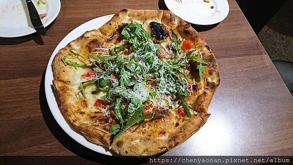 黃檸檬沙丁魚披薩xCaputo盃台灣大賽創意作品320元22:起司、沙丁魚、以及芝麻葉、番茄,目前這家店出過首推的口味,窯烤過黃檸檬的柑橘香氣襯托沙丁魚鮮甜海鮮,加上新鮮小蕃茄,窯烤製後水份蒸發後,留下的就是蕃茄甜味,沙丁魚及濃鹹的起司達到很順口的平衡。