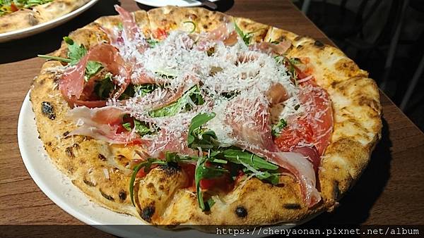 義式生火腿芝麻葉285元:札莫瑞拉起斯、帕馬森起司、番茄粒、芝麻葉、生火腿、橄欖油,義士生火腿經過窯烤,火腿蛋蛋的鹹香,配合札莫瑞拉起斯、帕馬森起司2種起司,感覺鹹香的口感加上芝麻葉清爽香氣的融合,算是中規中矩的比薩。