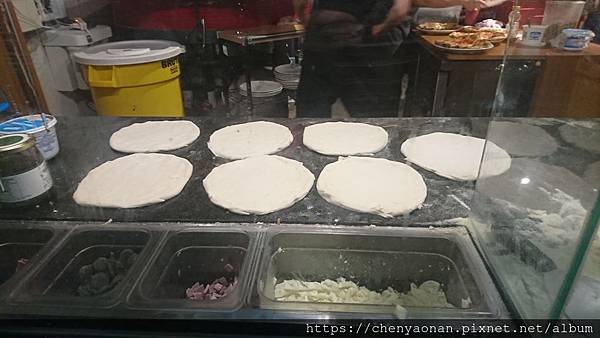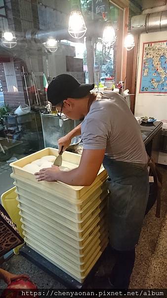 店門口透明櫥窗,可以看見師父當場製作PIZZA麵皮。