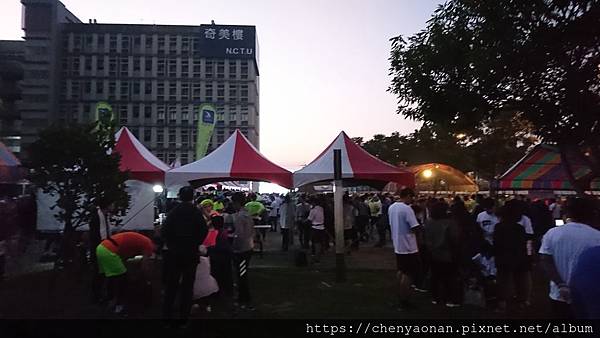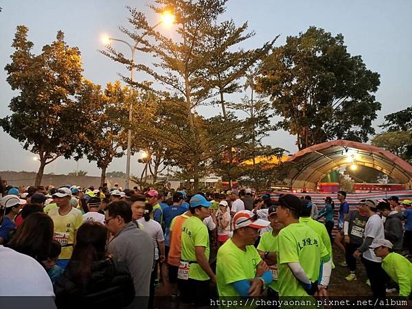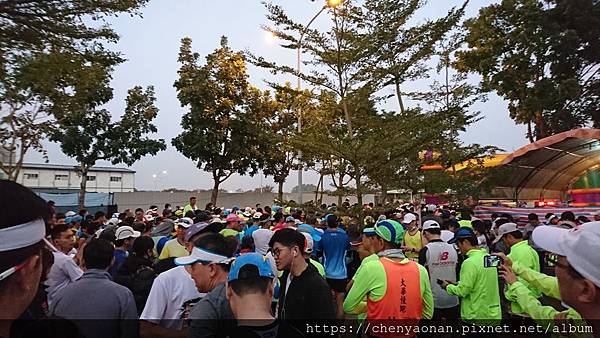 當天清晨5:50到達會場,天還未亮。本以為跟台北紮打國際馬拉松同一天,會不會報名人數不超過500人?最後會場大約聚集700~100人左右(全馬550;半馬500人),會場有點擠,如果真如開放4000人報名,這樣會場可能一團亂吧。