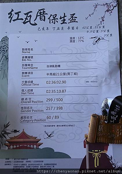 2小時35分跑回終點,真可惜都沒練習,不然一定可以進2小時30分。前5km根最後5km用跑的中間有3次走1km跑2~3km。