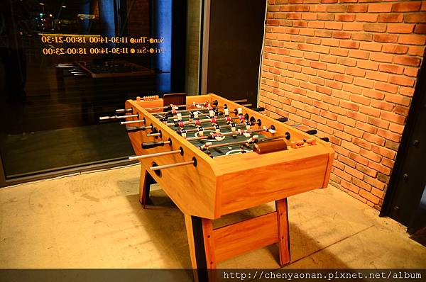 餐廳入口的足球遊戲台,背後是餐廳營業時間。