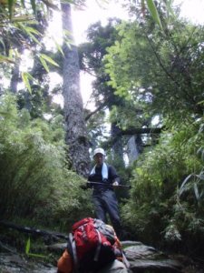 回去的路已經下起了傾盆大雨,山中起了大霧,13:08出發,此時我兩雙大腿已經發麻酸痛,走到沒知覺了,而且領隊說這段回去的路是最困難的。有兩座山頭是最困難的,要拉著繩索上去。我那時實在不覺得我可以爬的上去。領隊那時看著我累翻的臉說:「背包我先幫你背過這兩個山頭,不過你走不動時我不背你。」我那時說:「我在怎樣一定自己一步一步撐完爬下山的。」