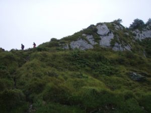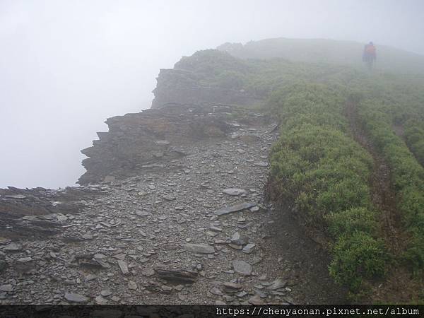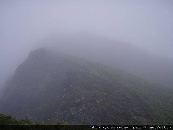順著原路回去,此時山已經開始飄起了霧氣,在回休息點已經有飄了幾滴雨,待會可能會下起大雨,所以領隊才不在西峰停留,繼續趕路往之前休息點前進。我的水壺果然掉在「500障礙坡」路上,因為想也大概猜的到,那麼「整人」的路,會讓人爬到都不認得今天是幾月幾號了。