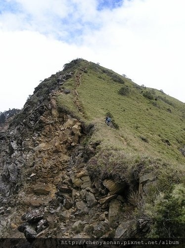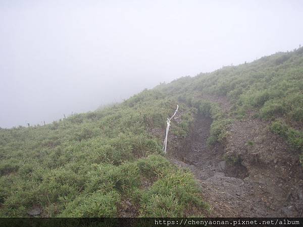 翻過最難走的這一段路,15:25到了合歡山北峰,接著順著原路回去領隊說:「一定要趁天黑之前下山,否則天一黑又下雨,氣溫下降會很快,很容易失溫,登山最常造成的死亡就是失溫。」雖然領隊說下到登山口只要40分鐘,不過我之前爬玉山的經驗是下山的時間其實跟上山的時間差不多,不會比較快,況且我腳感覺快斷了,不可能用衝多快的下山。所以,自己預計16:30能走下山。