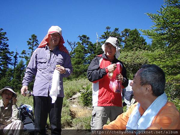 9:16本來以為這裡就是西峰,結果只是個中途休息點。在那裡巧遇「廚司登山隊」的林領隊(最右圖頭包橘毛巾那位),本來是要跟他們去爬合歡山群峰的,結果遇上鳳凰颱風取消。那天在這裡的休息點巧遇上可真是所謂:「有緣千里來相會」。