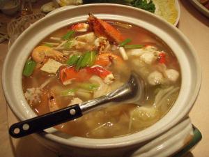 海鮮火鍋:這鍋海鮮火鍋湯底真好喝。火鍋料豐富;配色的也很好看,紅中有綠。