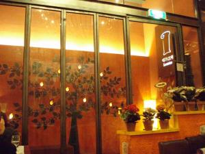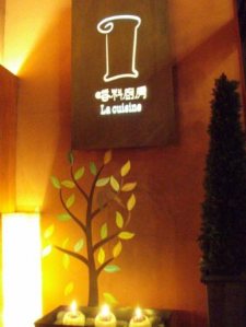 從我的位子看到餐廳入口牆壁的桃樹燈飾。