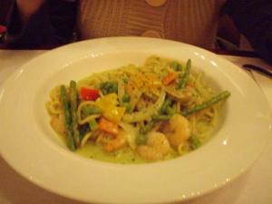 當天還有點的「奶油青醬海鮮義大利麵」:用新鮮蝦仁、義大利香料、橄欖油與義大利麵及蔬菜去炒,吃起來菜與麵的比例搭配的很好,醬汁也很順口。