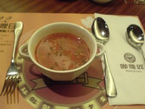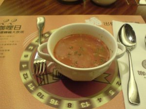 <羅宋湯>:用洋蔥、肉片、高麗菜、 胡蘿蔔、馬鈴薯、番茄熬煮的蔬菜湯。