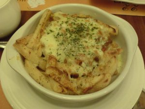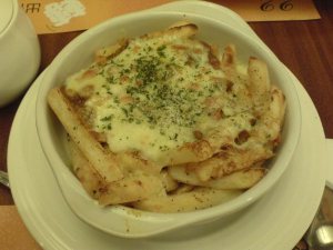 焗烤薯條:一般的炸薯條,上層有厚厚的焗烤,灑上海苔粉。(推薦給~愛吃焗烤或起司的人請必點)