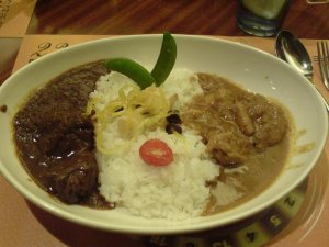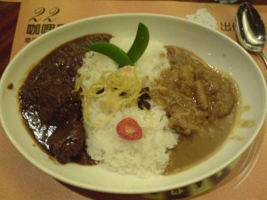 當天主餐:<雙色咖哩>240元:焙燻是印度風--辛香料香氣濃郁(右邊);歐品則是日式風--口味比偏甜、醬汁濃稠(左邊)。在這裡用餐,「飯」跟「咖理醬」都可以無限加量,算是很划算的餐廳。
