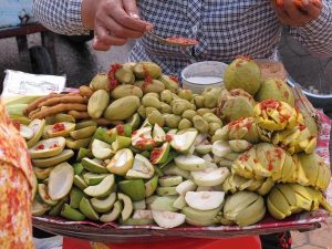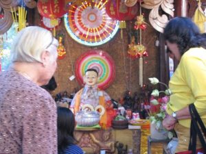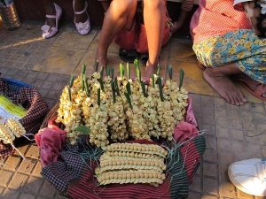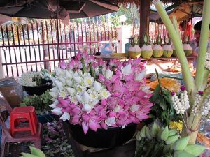 寺廟旁販賣拜拜用的蓮花與椰子。