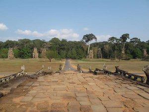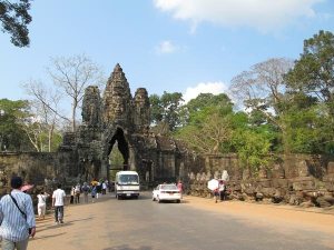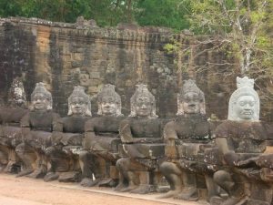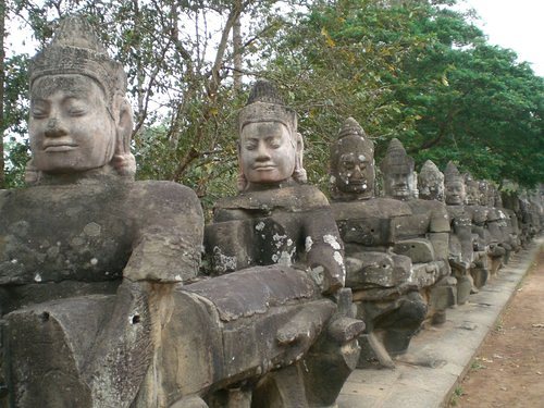 由大吳哥城南城門進入,可以看見高度20公尺 Jayavarman七世的醒目石雕。兩旁左邊是善的力量(神);右邊是邪惡力量(魔),左右各27尊的石像,用一條七頭蟒蛇在海中須彌山拔河的了1000年的故事。在南城門口前下車後換上小巴士,進入大吳哥城參觀。