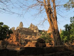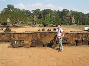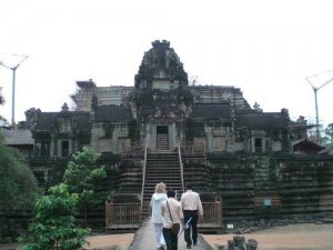 【吳哥古皇宮﹝又譯空中宮殿﹞Phimeanakas】由羅貞陀羅跋摩二世所建,是一座全石砌的塔形建築物為,根據記載.古時此塔鋪以金箔.而且高臺上四周並有石砌迴廊環繞.因此在「真臘風土記」中稱為在「金塔」,船說金塔市共養九頭蛇后的地方.夜晚會化成女子.每晚國王必須與蛇后同睡.不然國王就會有災難發生。