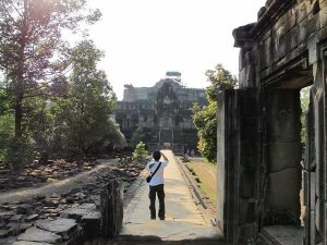【巴本宮Baphuon】這座巨大的神殿山是早於十一世紀中期所建的國廟.在「真臘風土記」所記載中.神殿甚至高過巴戎廟.象徵印度教的須彌山.最外為長寬各為425與125公尺.東側正門與象台在一平行線上.通過此門沿長172公尺由矮柱支撐的砌道.就抵達巴本宮所在的東門。遊法國人原本預計花費15年於2008年修建完成,不過修復拼裝與想像中困難,預計還要在20年的時間才可拼裝完成。尚未拼裝部分為黃色部臥佛位置。橘色部份是現在正整修部份。