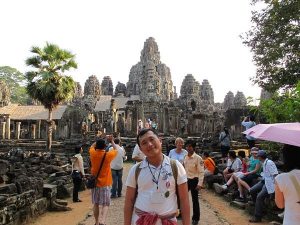 【大吳哥城】它由54座大大小小寶塔構成。位於柬埔寨北部的暹粒省,曾長期淹沒於叢林中,直到19世紀才被法國探險家亨利穆奧(Henri Mouhot)發現。吳哥遺址自東至西全長約為五十餘公里,大吳哥城位於北方,每邊長三公里,是高棉吳哥王朝全盛時期﹝西元875-1230年﹞所遺留下來的不朽建築群;享有「雕刻出來的王城」美譽。在進入都城﹝南城門﹞前,遠遠便會看到高達七公尺的大石城門上頭,四面都刻著吳哥王朝全盛時期的國王面容,既有君臨四方的威嚴,又有觀照世人的慈祥。