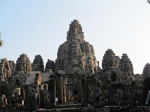 【巴戎廟Bayon】﹝又譯巴揚寺或百茵廟﹞其中最特殊的設計,是每一座塔的四面都刻有三公尺高的闍耶跋摩七世的微笑面容,204個微笑浮現在蔥綠的森林中,多變的光線或正或側,時強時弱地探照,樹草中的蟲鳥此起彼落的交織輪唱,好似一個設計新穎的聲光舞台秀,成為旅客最深的印象,被世人稱為「高棉的微笑」。