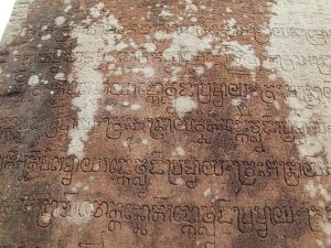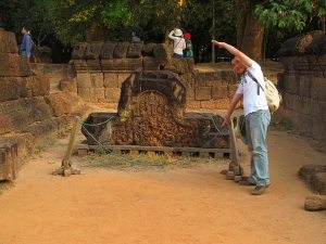 小吳哥城護城河入口,橋面經聯合國整修後,有一半橋面有坍塌的現象。路途中看見類似腳印的石頭。