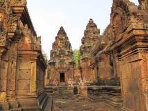 一大清早7點進入「女王宮」參觀,少去人群的吵雜,它靜靜的躺在我們的眼前。【女皇宮】,建於十世紀,公元967年時值闍耶跋摩五世王朝,此地為尊奉婆羅門教三大主神之一的﹝濕婆神Shiva﹞。由於建造此座古剎的石頭為美麗的粉紅色,此廟壁畫的雕工是所有吳哥古蹟中最精緻細美的,其中最令人讚賞的是創作者竟能將堅硬的石塊,如雕刻木頭般琢磨出層次分明線條柔纖的精細作品,不論門楣或石壁或窗櫺,都刻鏤的一絲不茍,巧奪天工,妙不可言,是吳哥所有寺廟中石雕作品最上乘,也是柬埔寨藝術的顛峰之作,故又有「吳哥藝術之鑽﹝Jewel in Angkor Art﹞」之美譽。