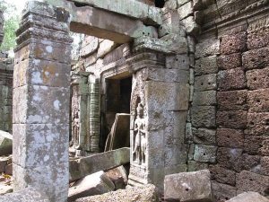 【塔普倫寺Ta Prohm】此廟建於12世紀末,尊奉婆羅門教及佛教,有巨大的樹木盤結在圍牆廟門口,更視為奇觀。百年老樹纏繞著千年奇石,彷彿愛恨糾纏般的浪漫,又因是加亞華爾曼七世為了紀念及祀奉母親而修建的寺院。塔普倫寺廟因為國內多次的佛教與印度教戰爭已被毀壞40%。