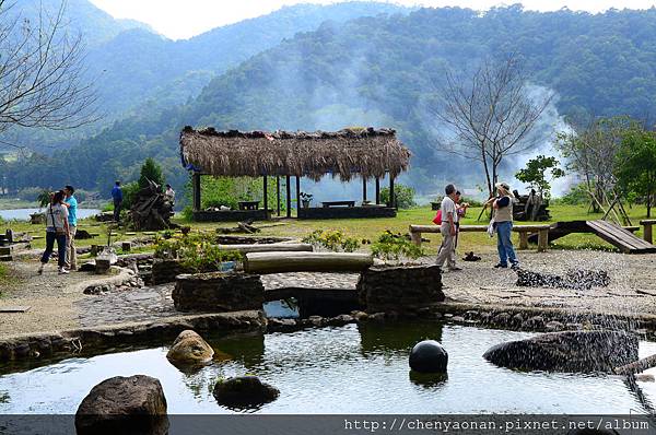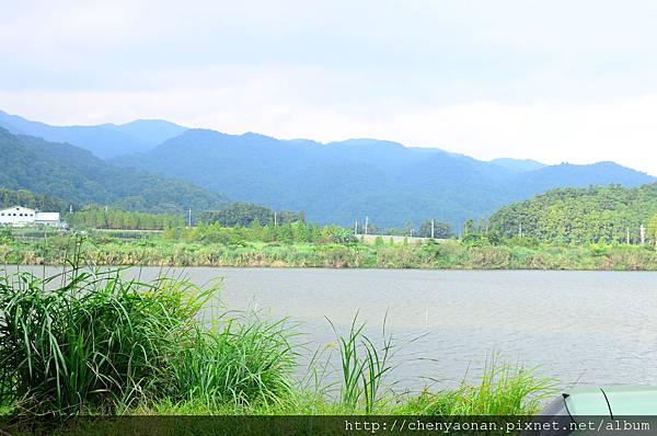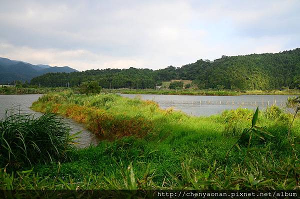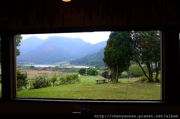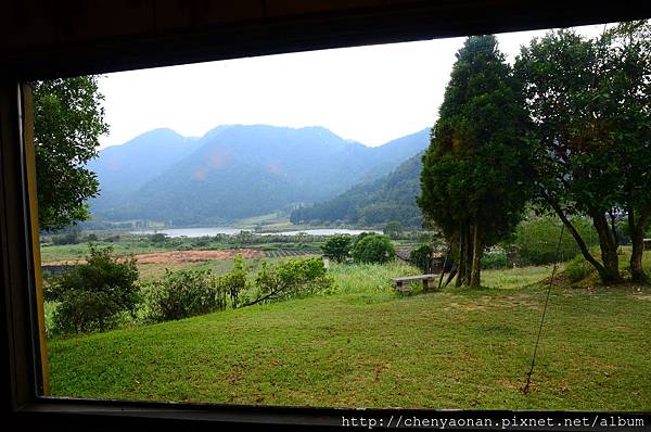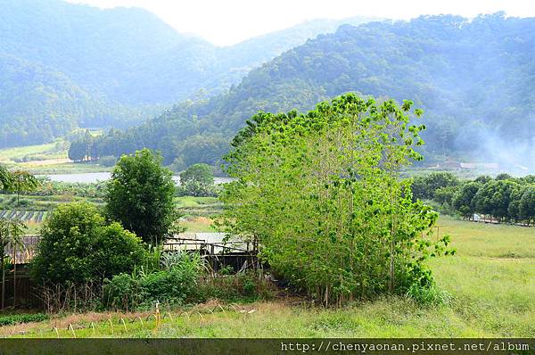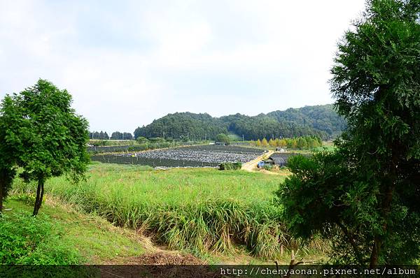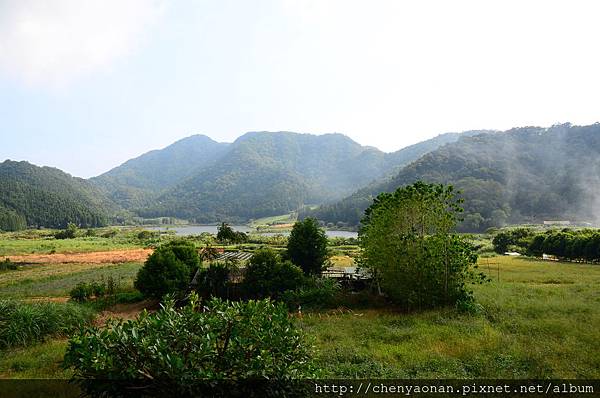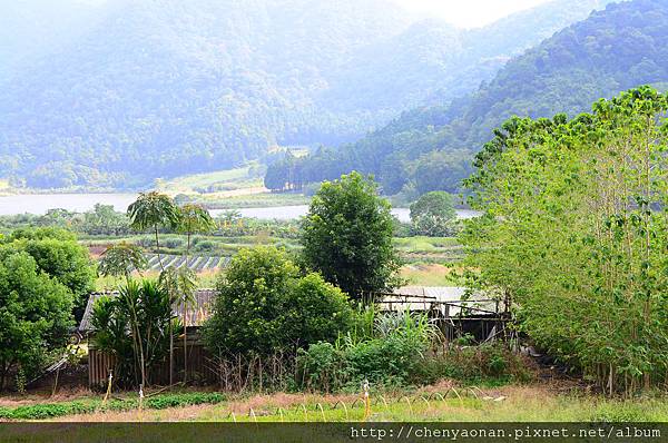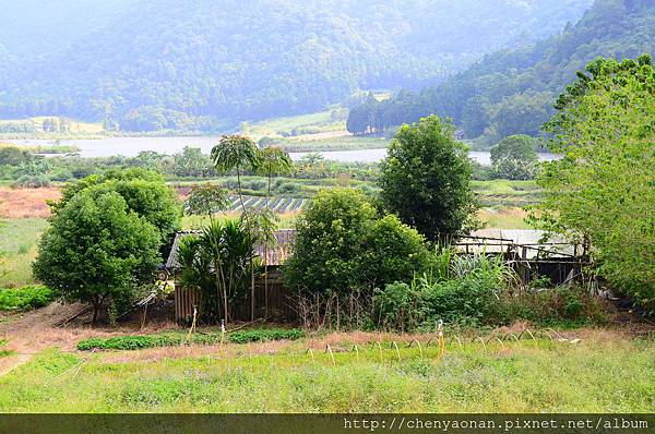 茅草涼亭可遠眺遠方湖光山色+農田。